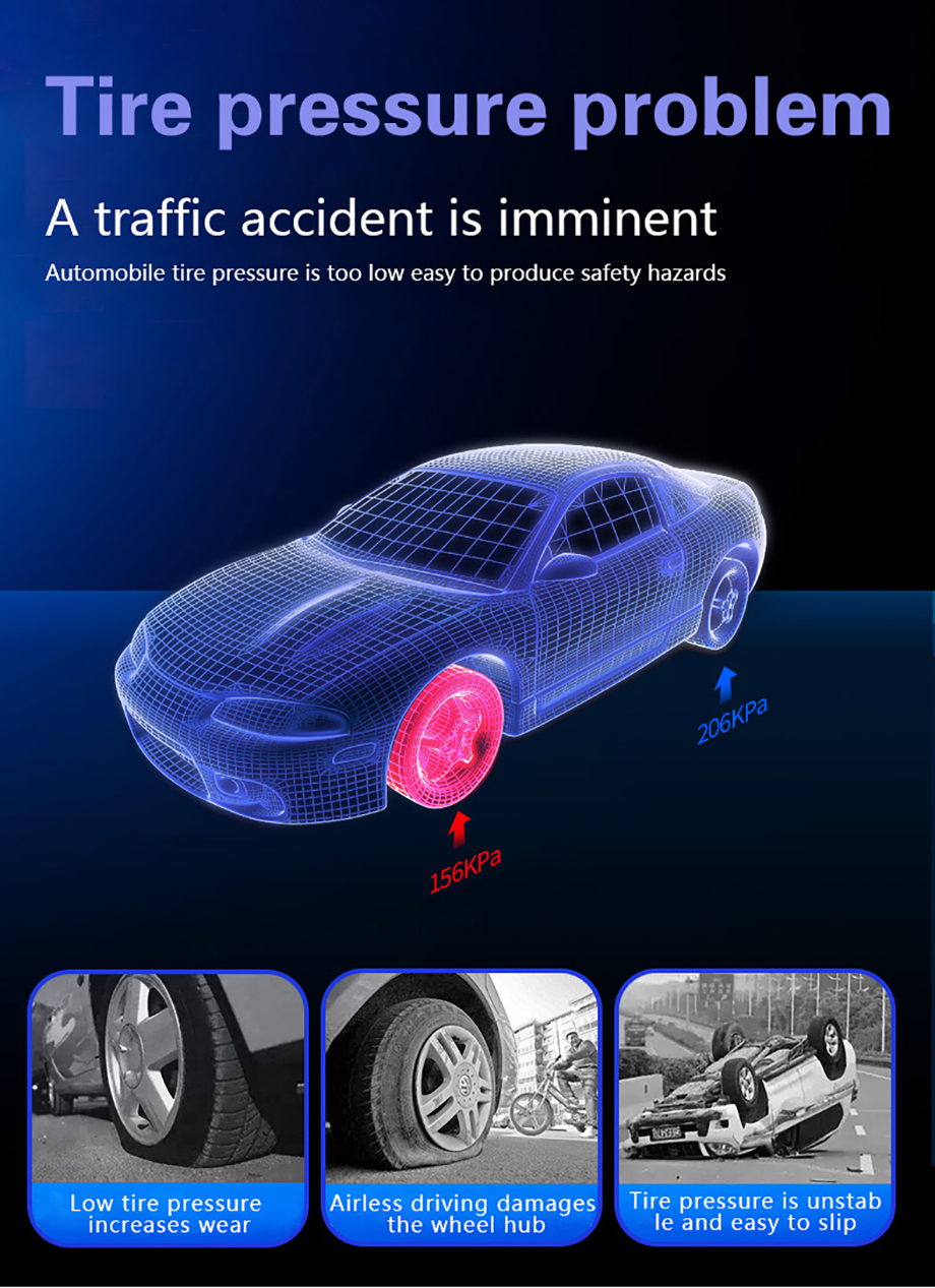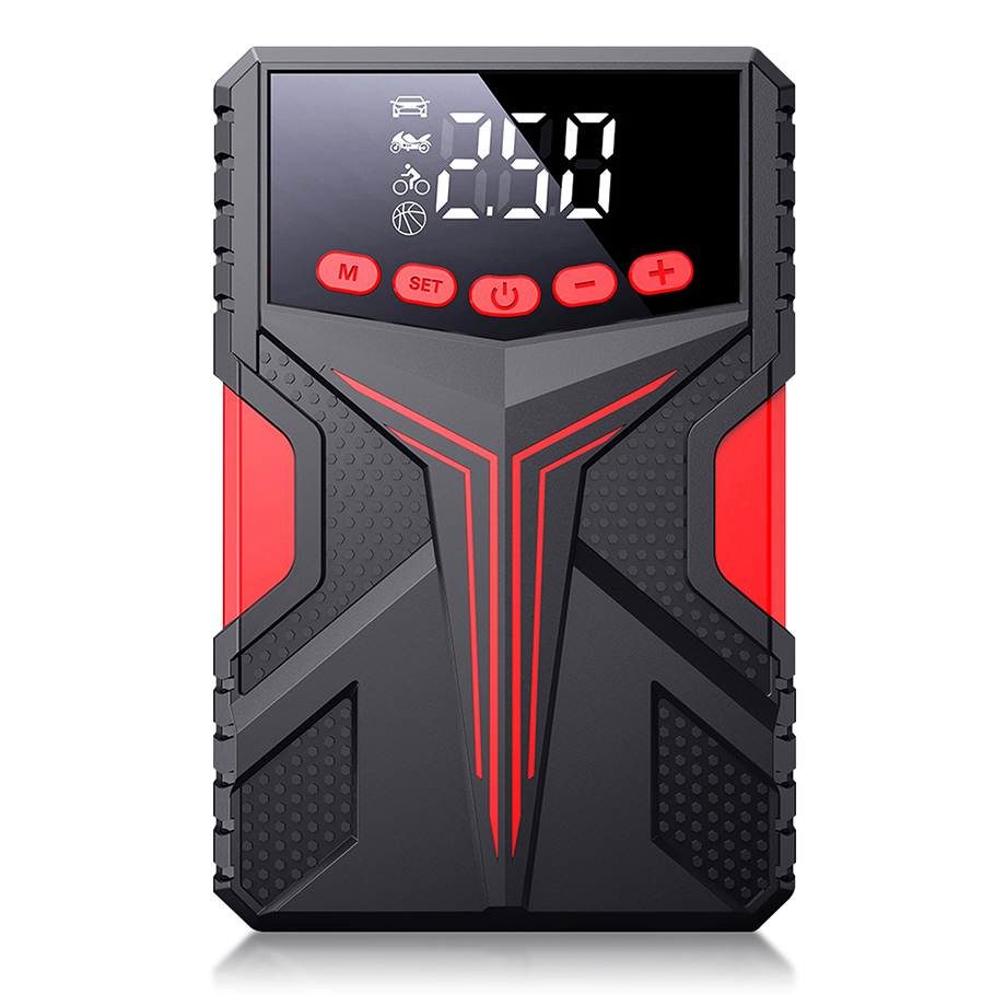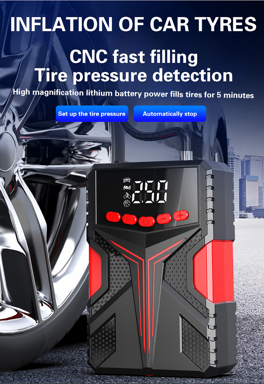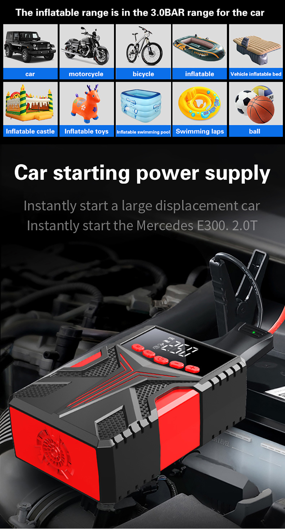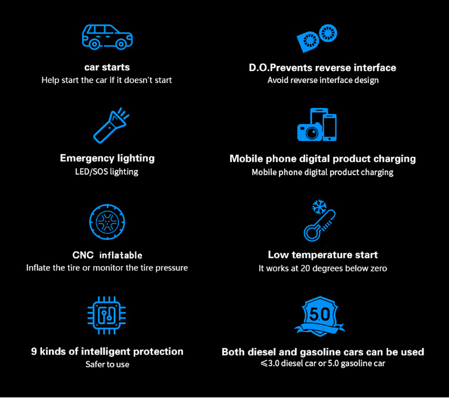 Car battery charging, tire pump, tire pressure monitoring, mobile phone charging, emergency lighting. |
