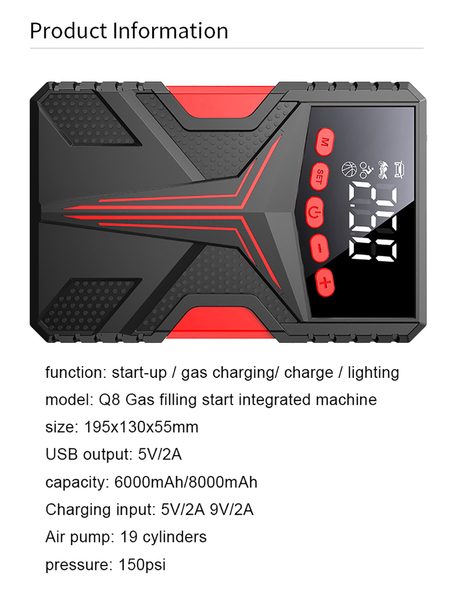 Car battery charging, tire pump, tire pressure monitoring, mobile phone charging, emergency lighting. |