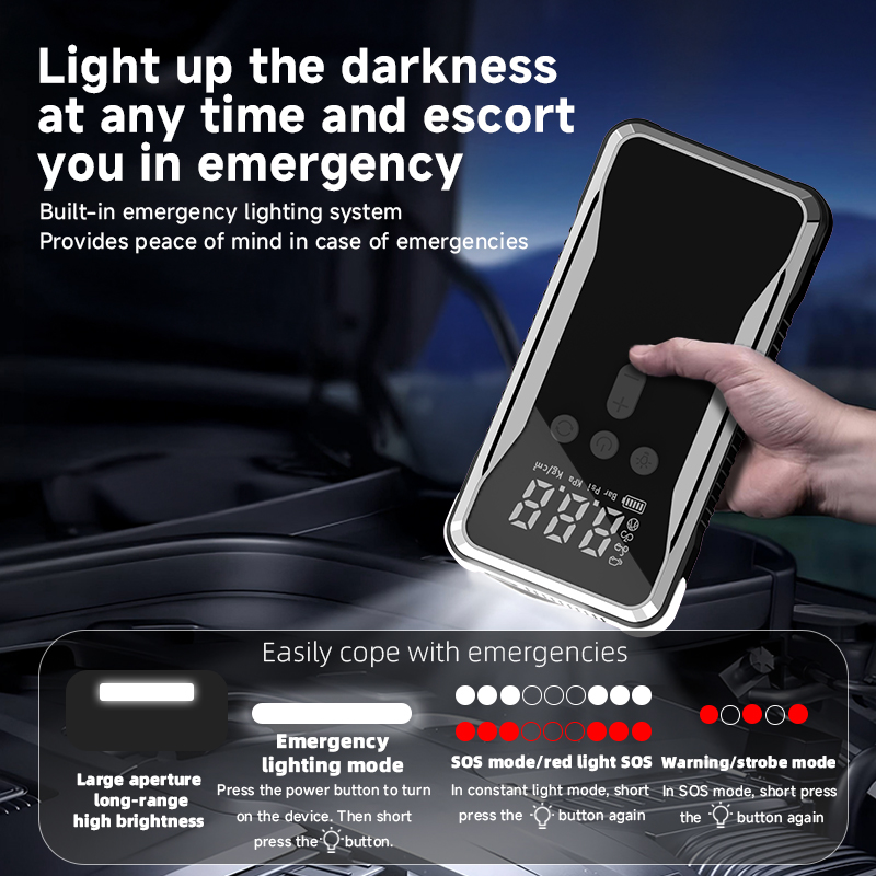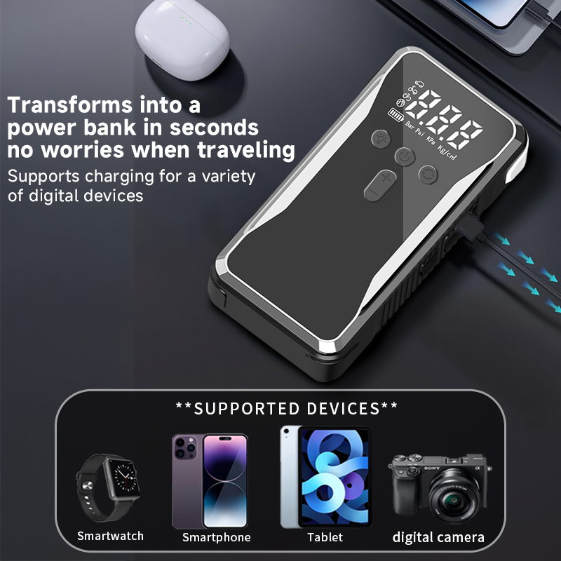 Car battery charging, tire pump, tire pressure monitoring, mobile phone charging, emergency lighting. |