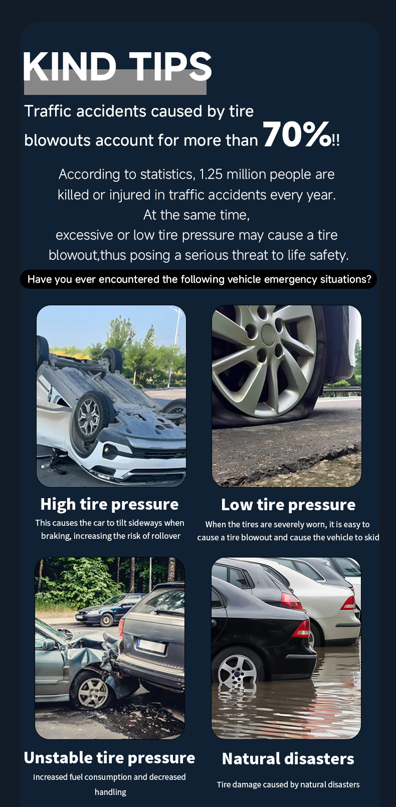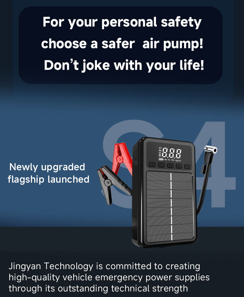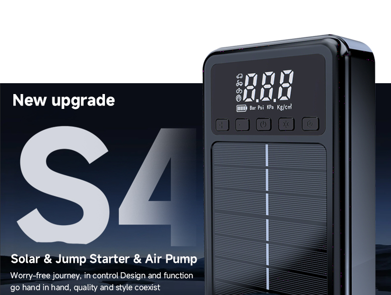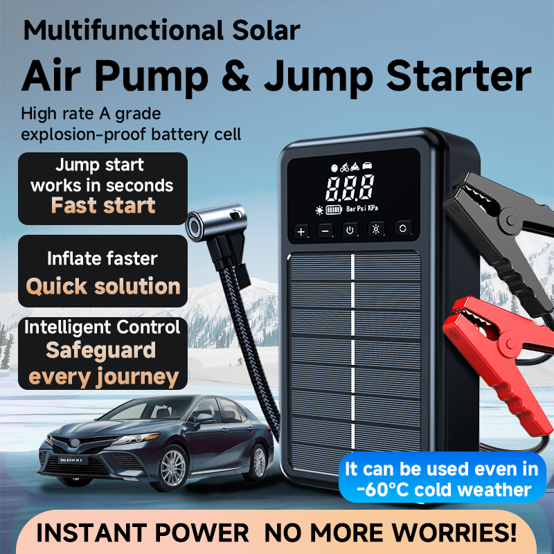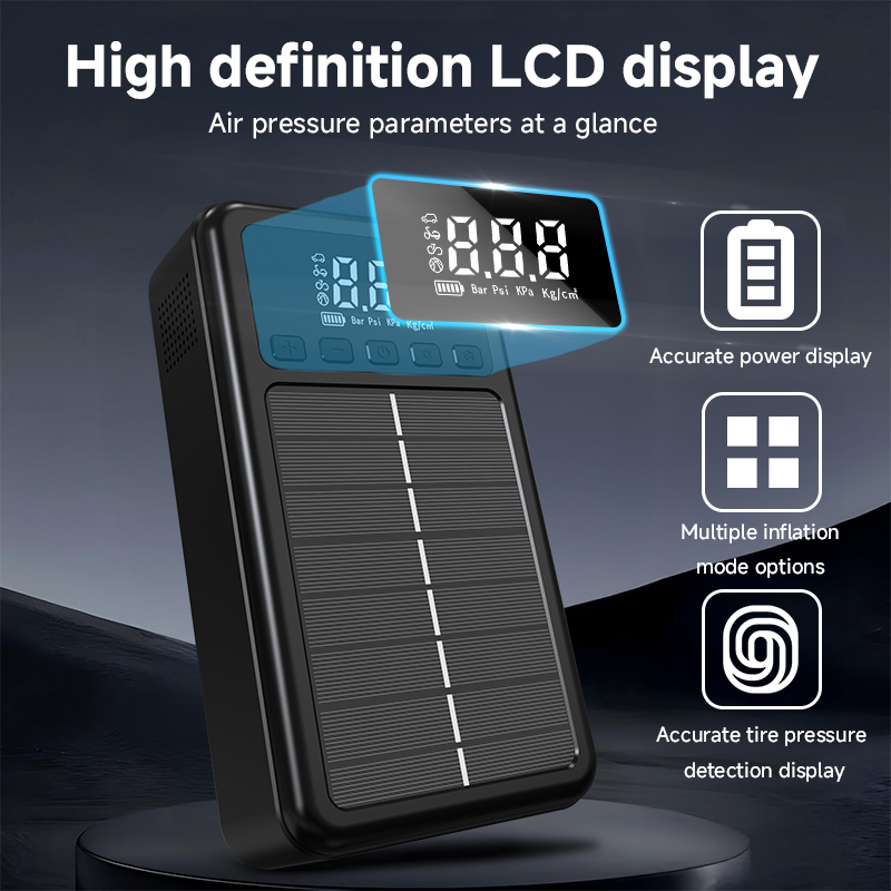 Car battery charging, tire pump, tire pressure monitoring, solar charging, mobile phone charging, emergency lighting. Logo: According to your desig |
