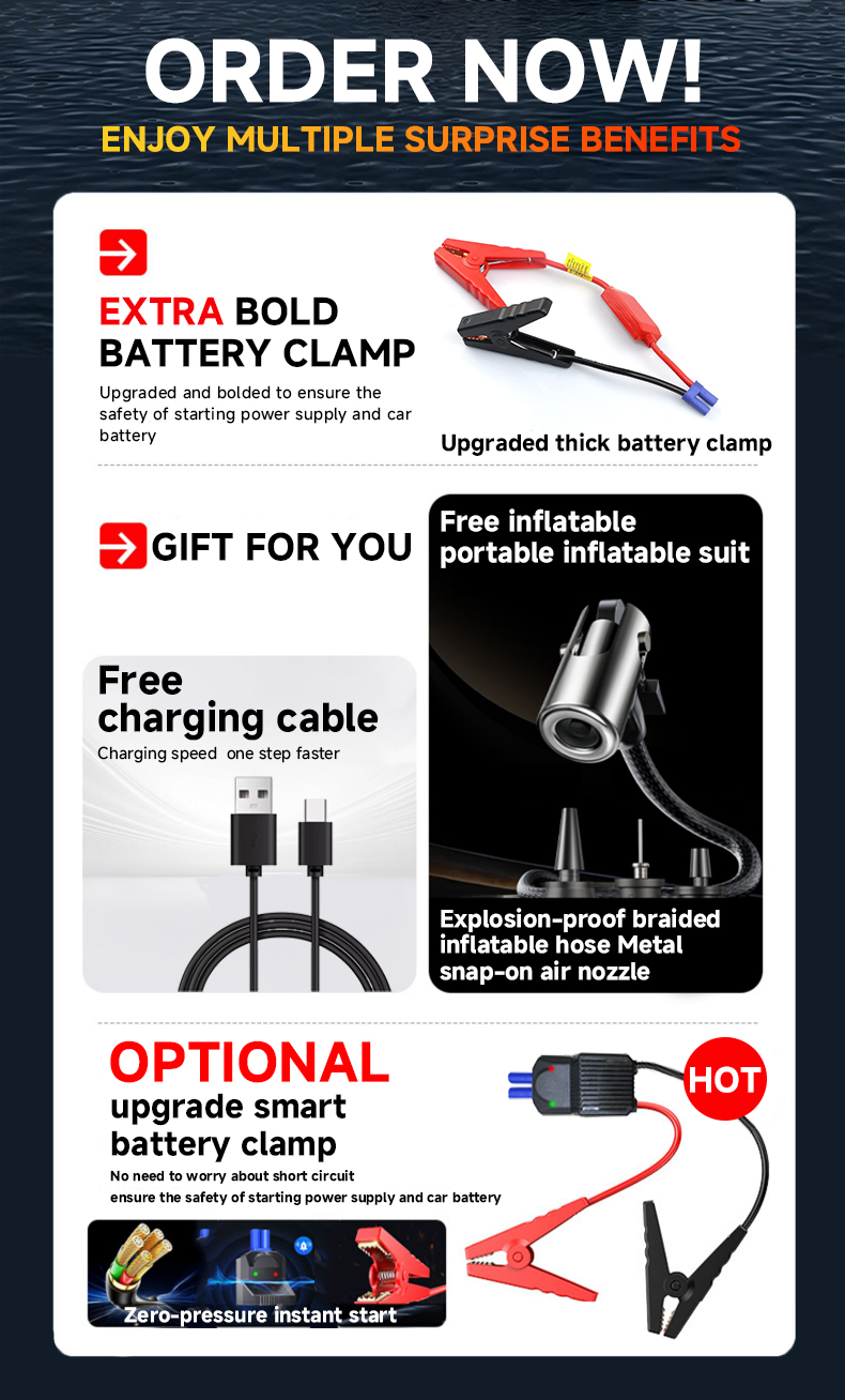 Starter*1, Smart Battery Clamps*1,Air Hose*1,Needle Valve Adapter*1,Bicycle Adapter*1,