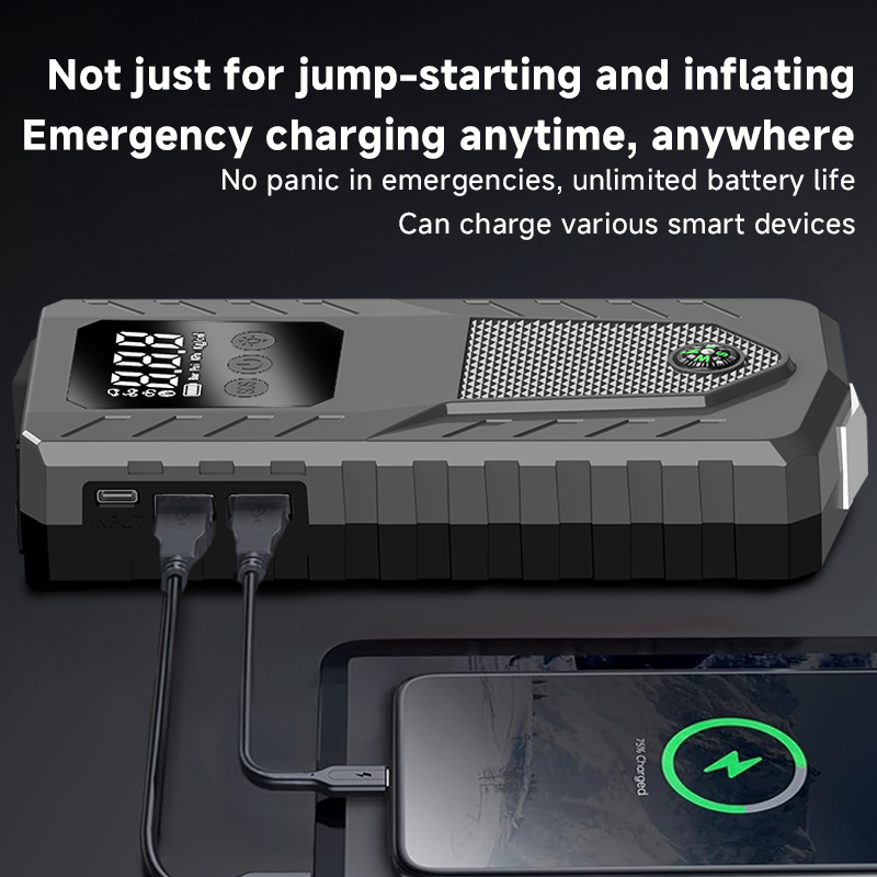 12V Emergency jump starting power supply allowing you to start your car anytime and anywhere, while also charging your mobile devices.